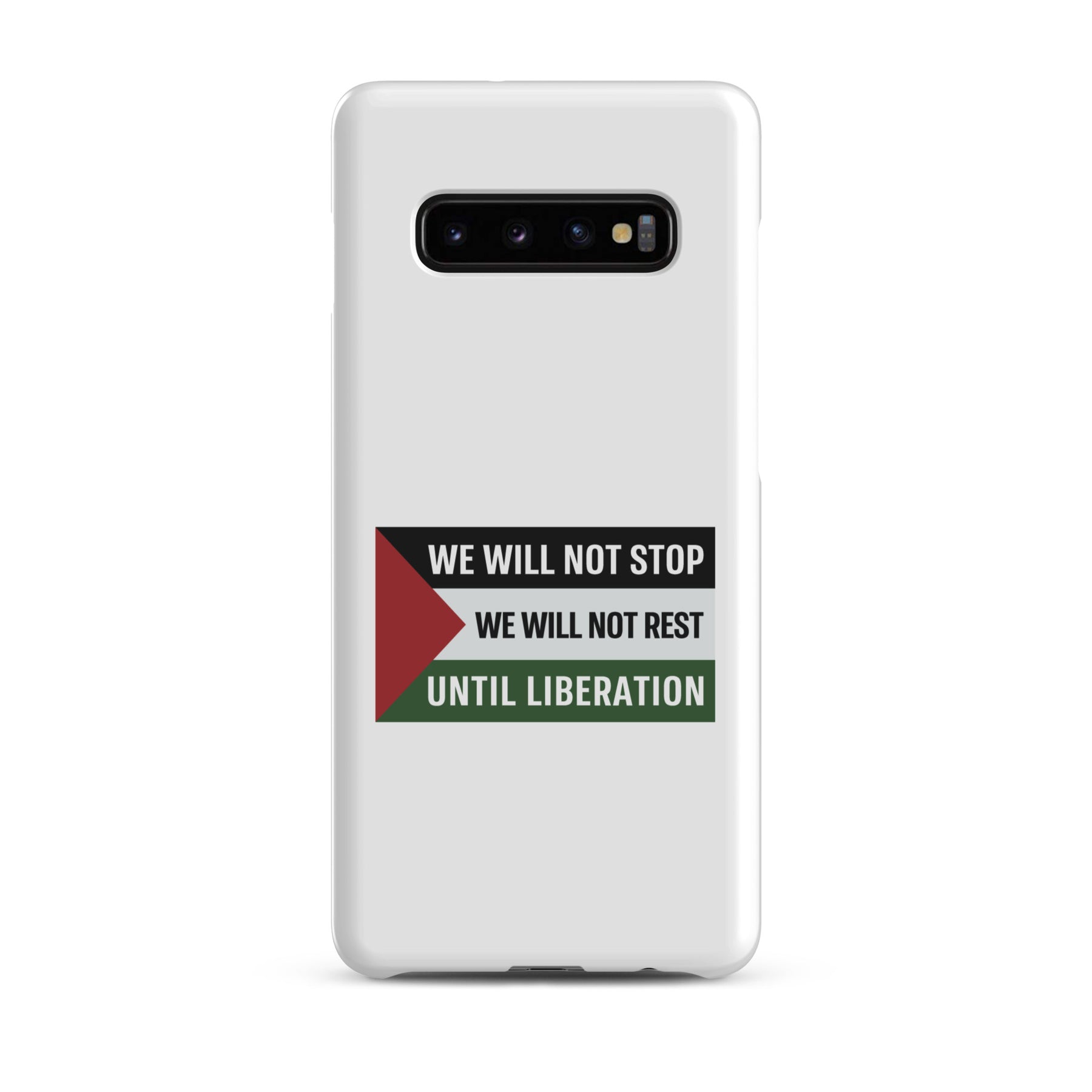 This Palestinian solidarity phone case for Samsung® devices combines sleek protection with powerful protest. The bold design reads: “We will not stop. We will not rest. Until liberation,” a clear statement of resistance and unwavering support for Gaza and the struggle for Palestinian freedom.