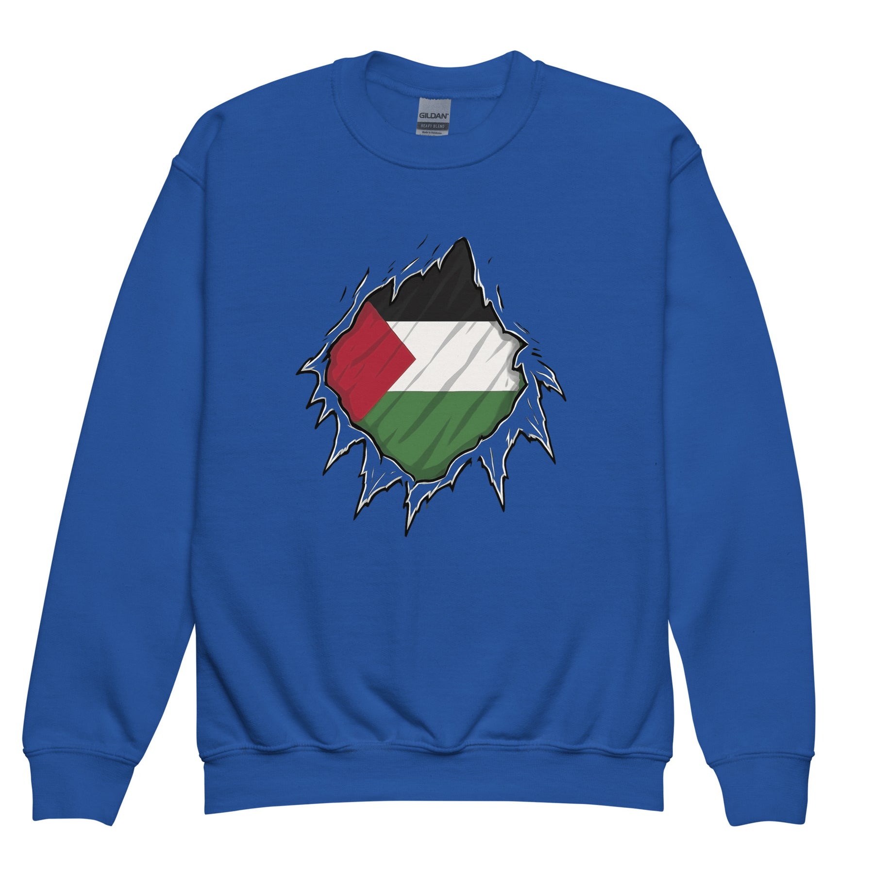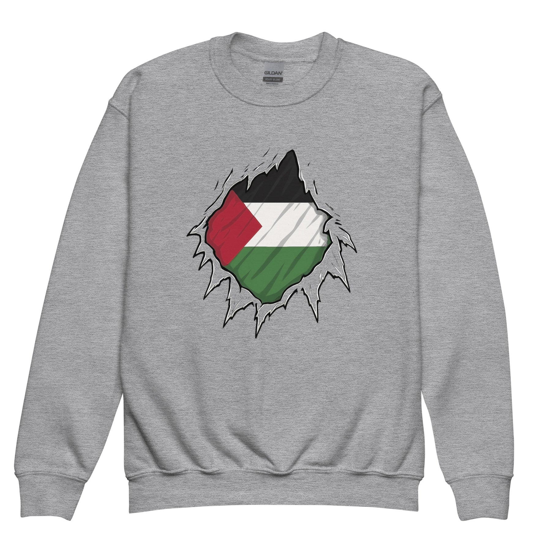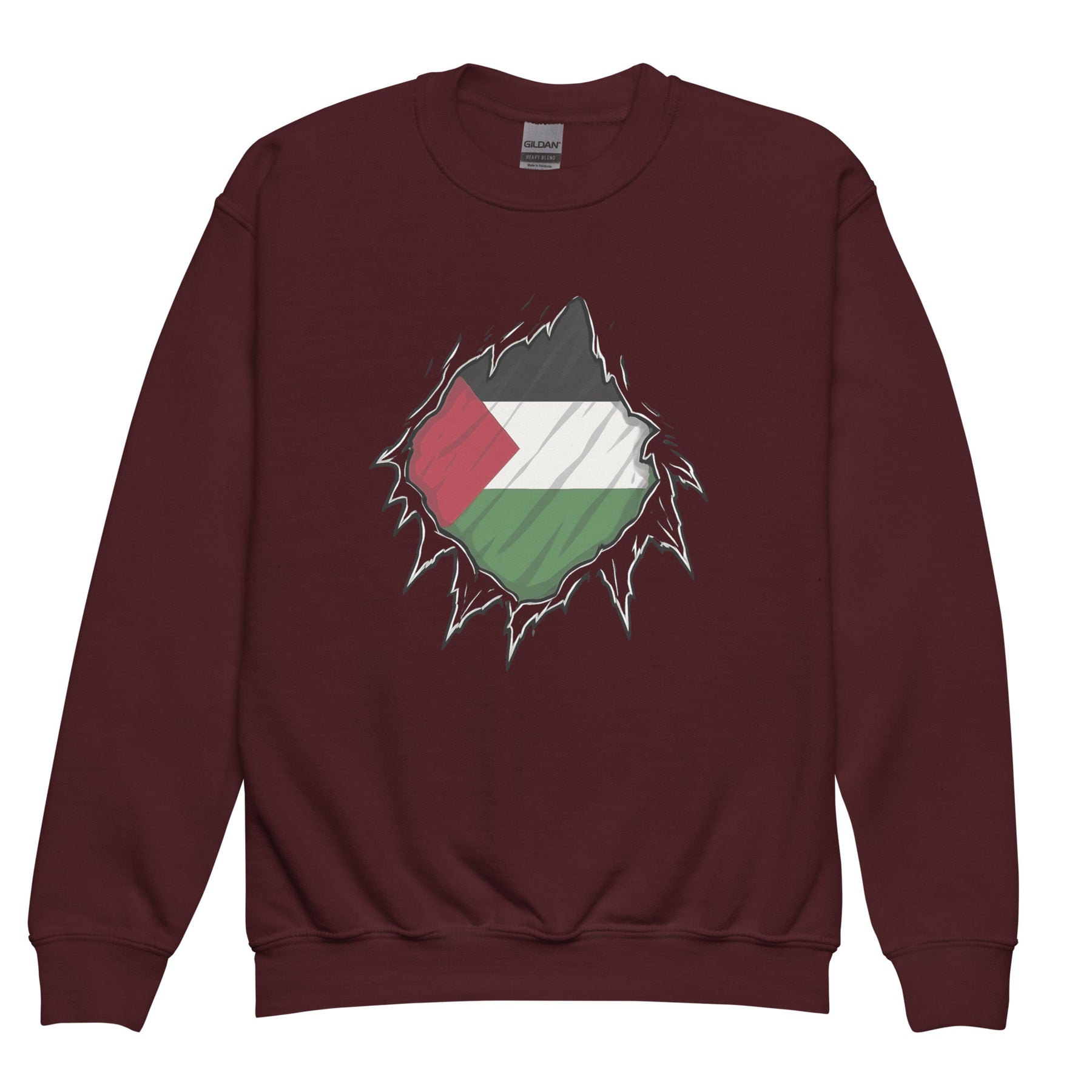 This cozy youth Free Palestine crewneck showcases a powerful design—ripped to reveal the Palestinian flag at its core. It honors the courage of every Palestine hero, encouraging the next generation to speak up and stand tall.