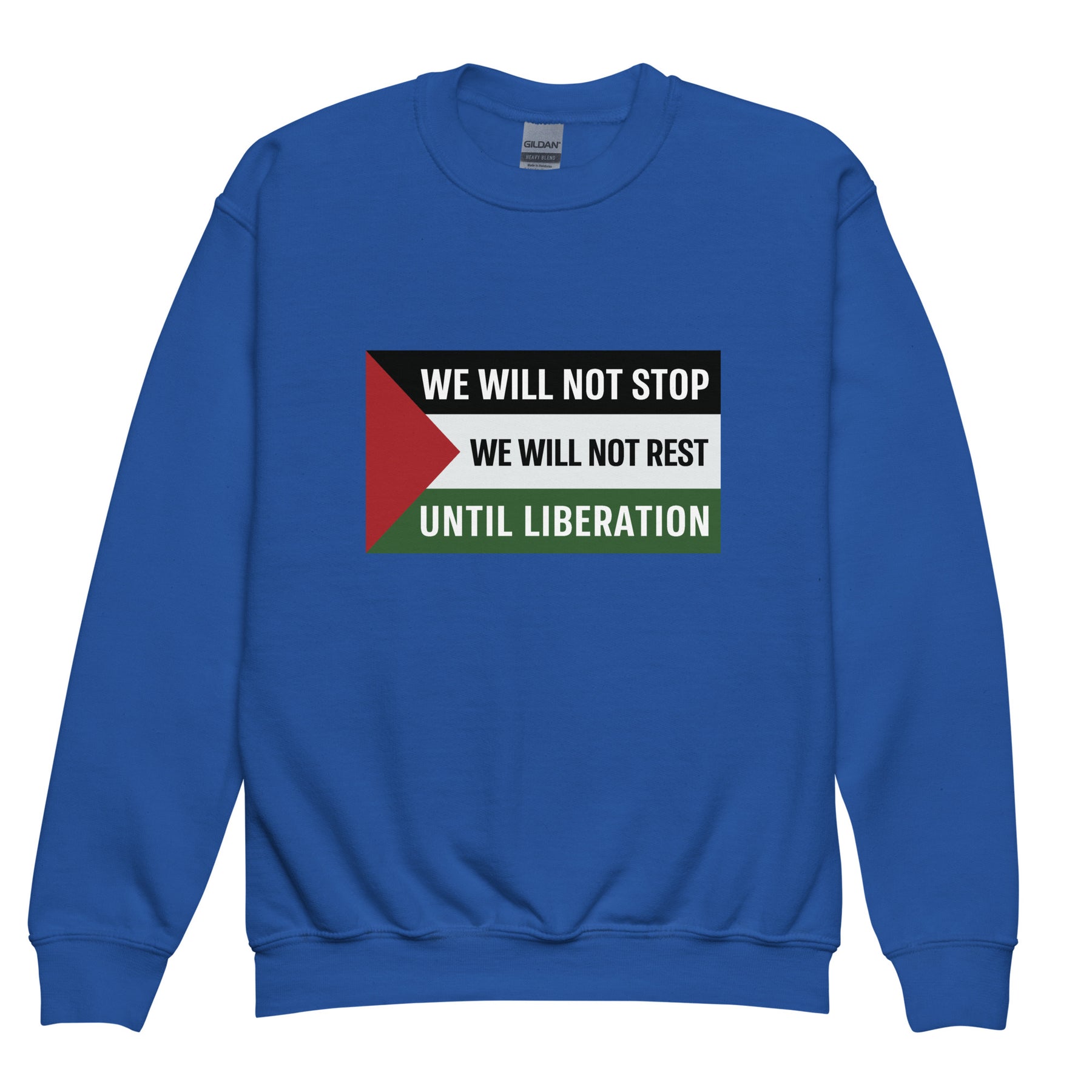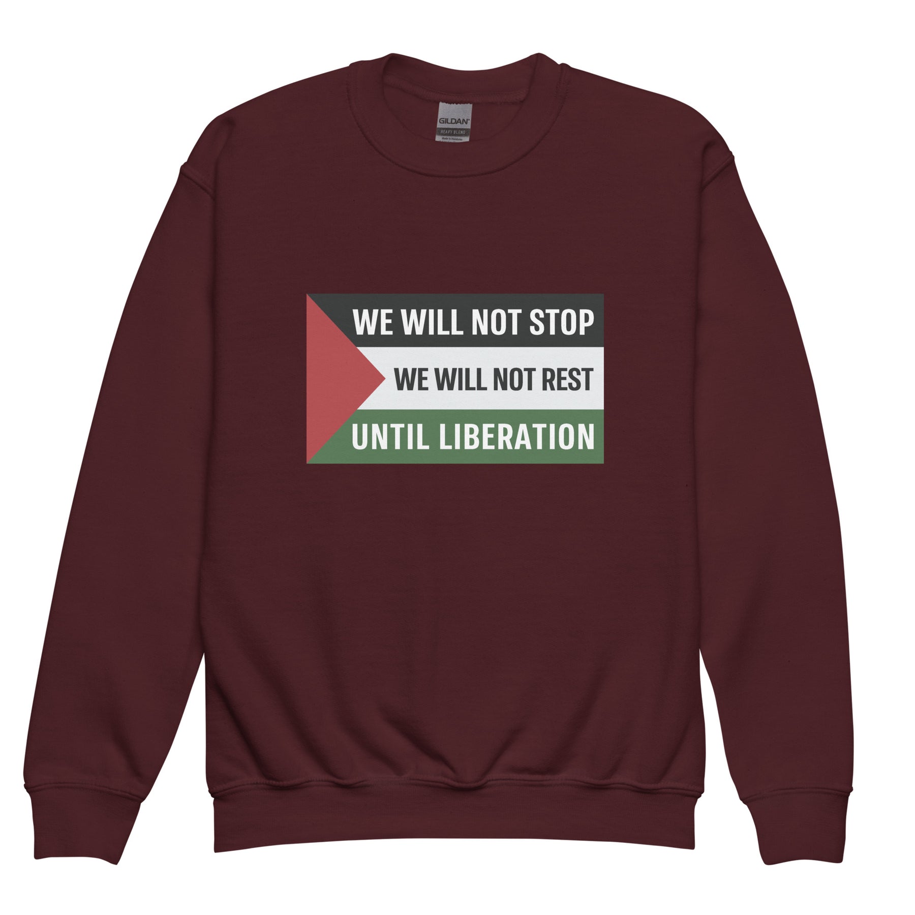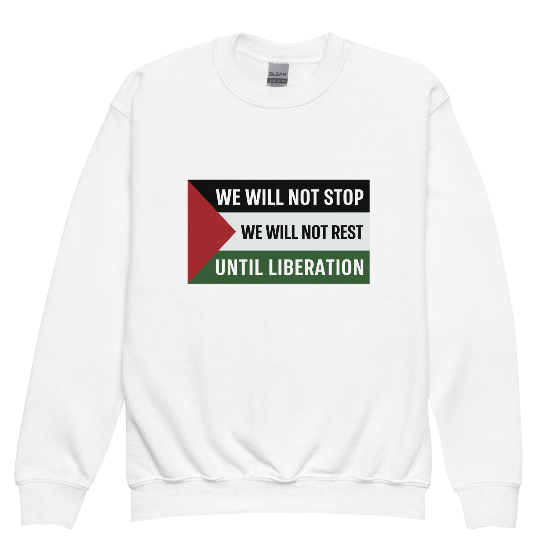 Empower the next generation to speak out—loud and proud. This Free Palestine youth sweatshirt features the powerful message: “We will not stop. We will not rest. Until liberation.” — a clear stance in support of Gaza, Palestinian rights, and global solidarity.