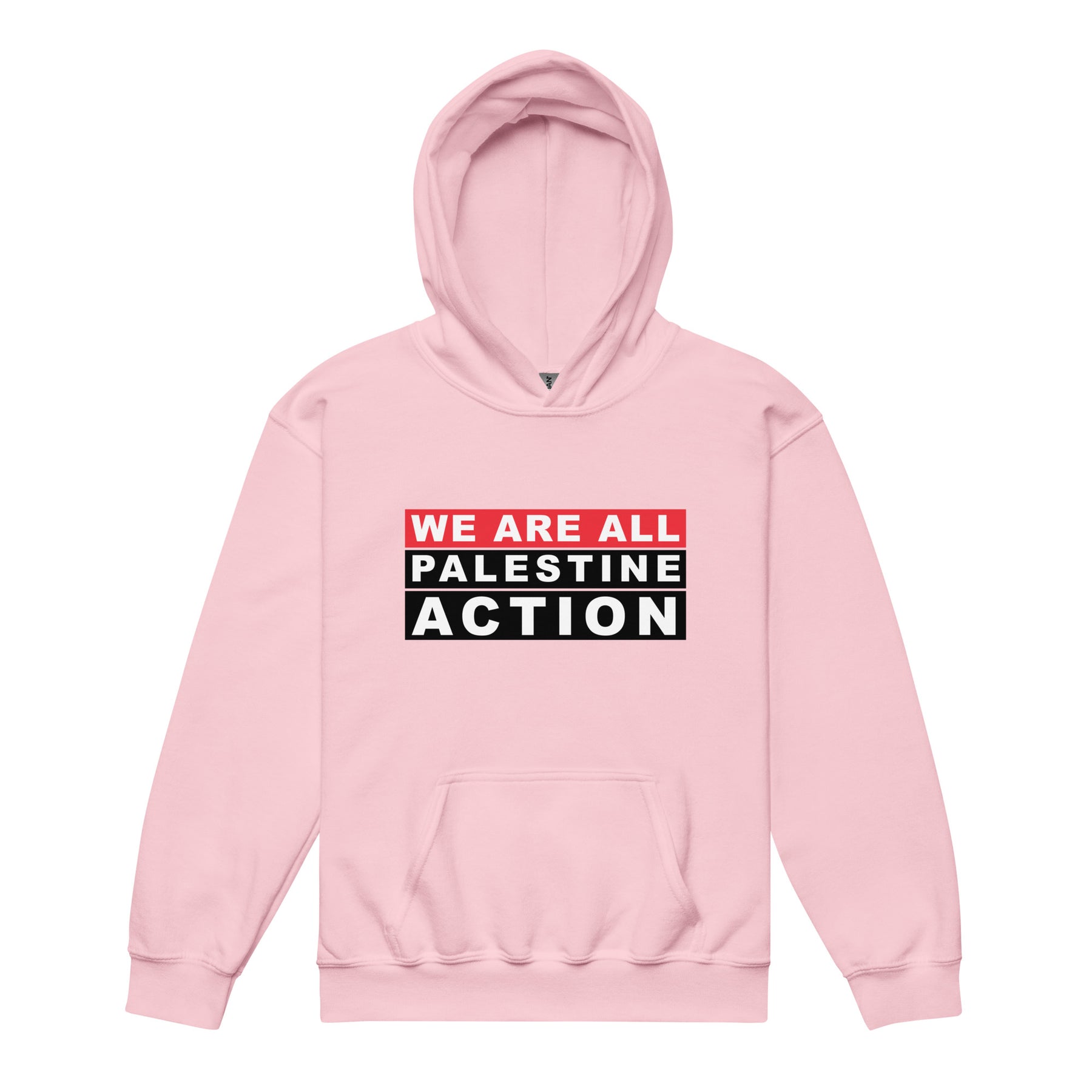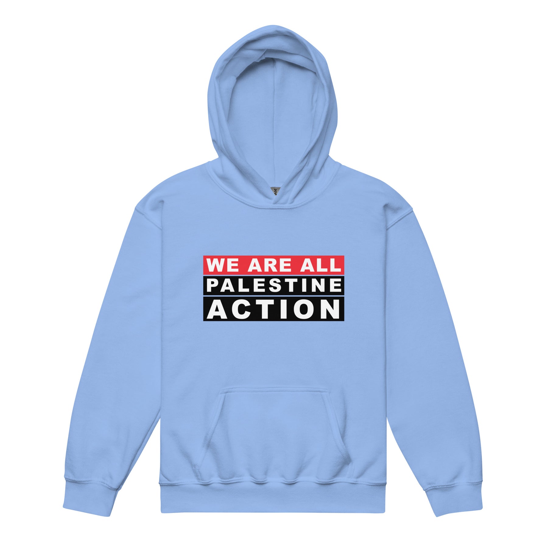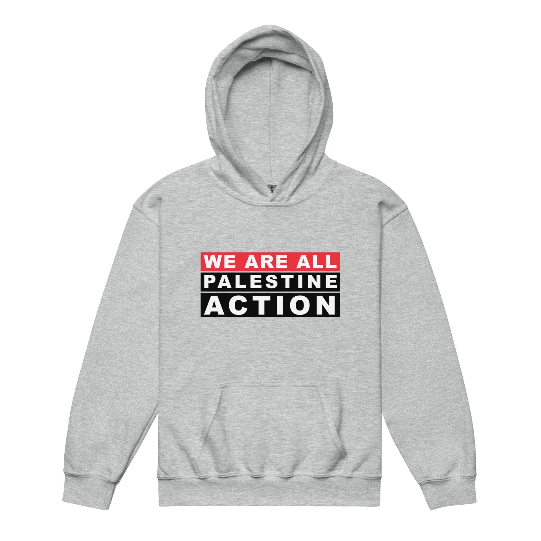 This warm, durable hoodie features the bold message: “We Are All Palestine Action.” Designed for comfort and built for movement, it’s perfect for school, rallies, and social media alike. A powerful way for young voices to stand in solidarity with Gaza and against the Israeli occupation.
