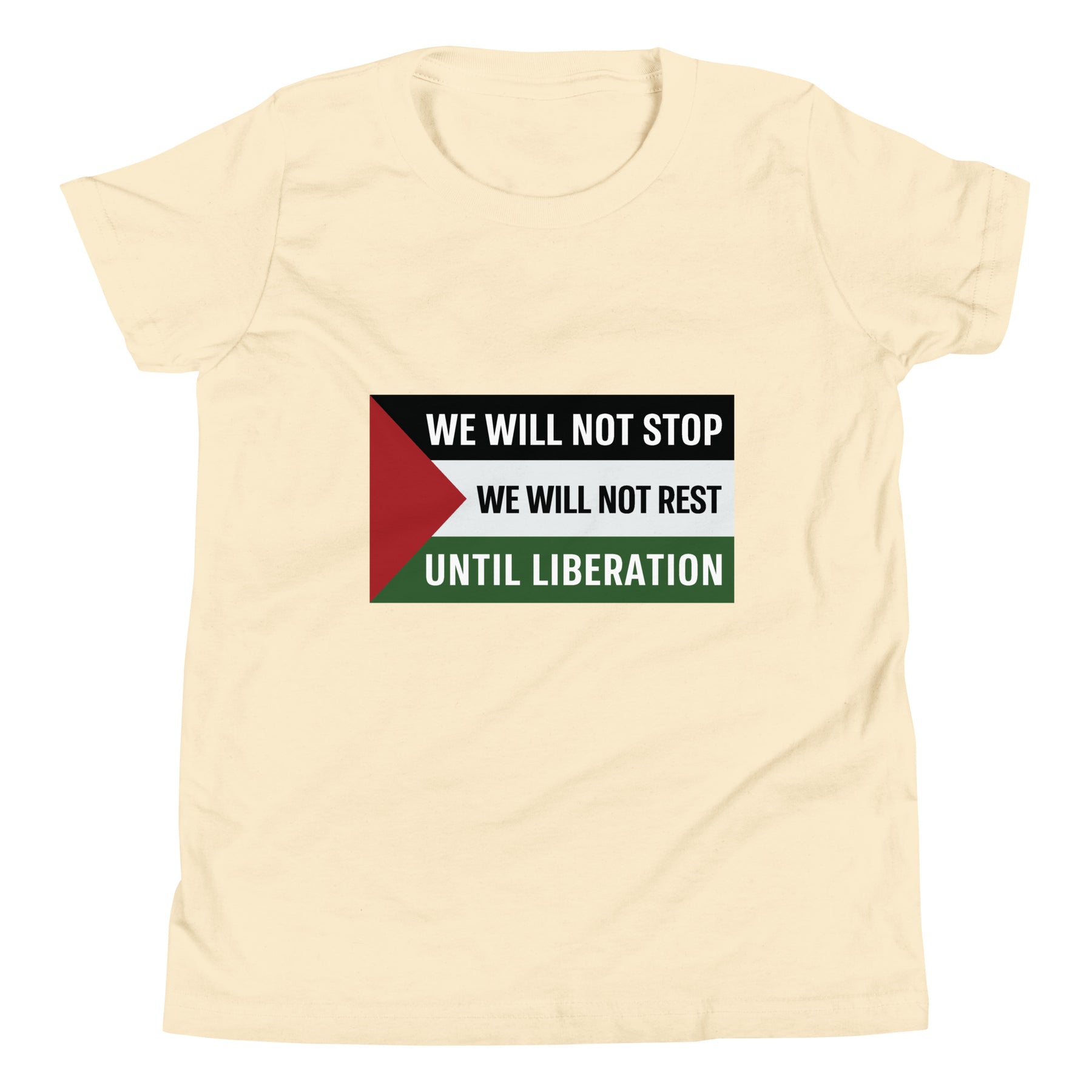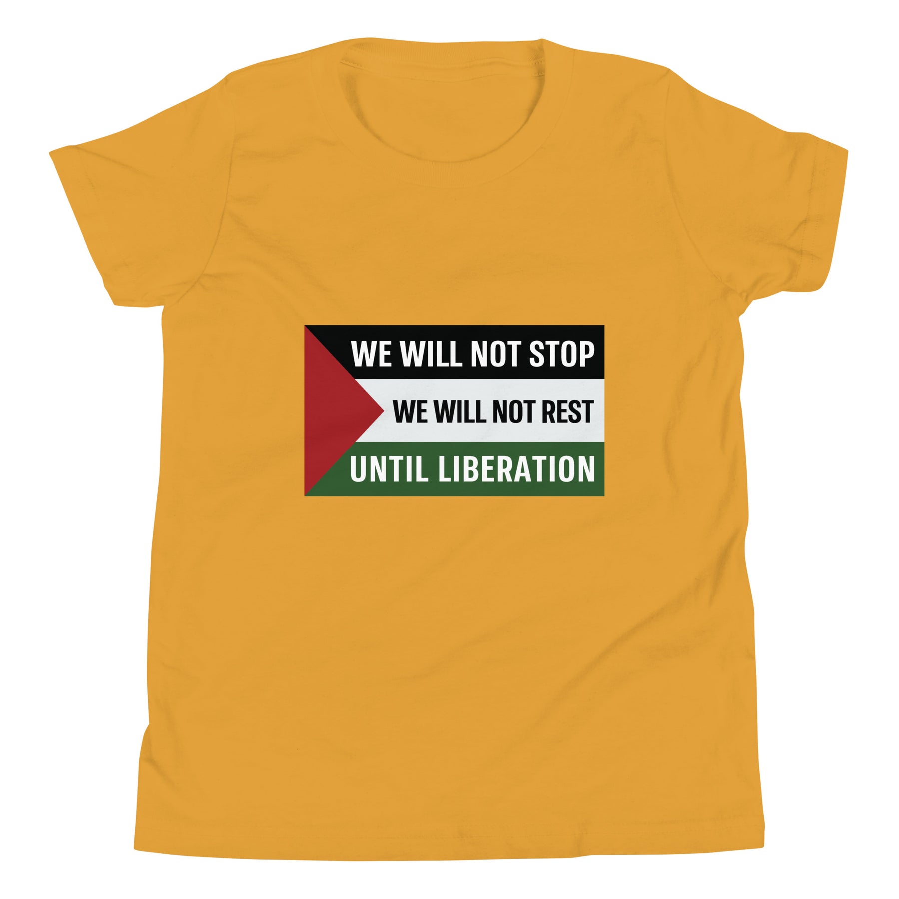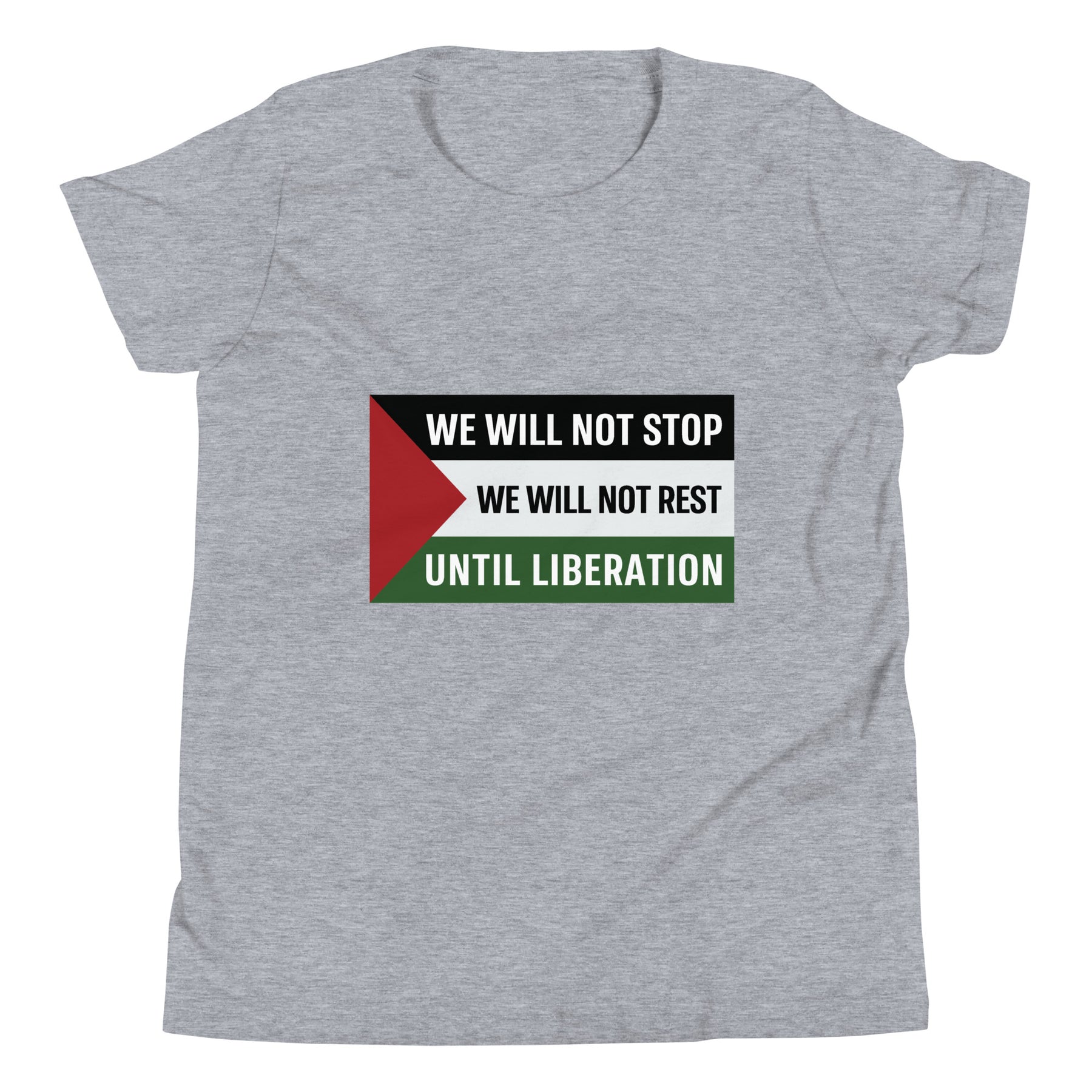 Let the next generation wear their voice. This soft, durable Free Palestine youth t-shirt features the bold declaration: “We will not stop. We will not rest. Until liberation.” — a message of hope, resistance, and unity with the people of Palestine and Gaza.