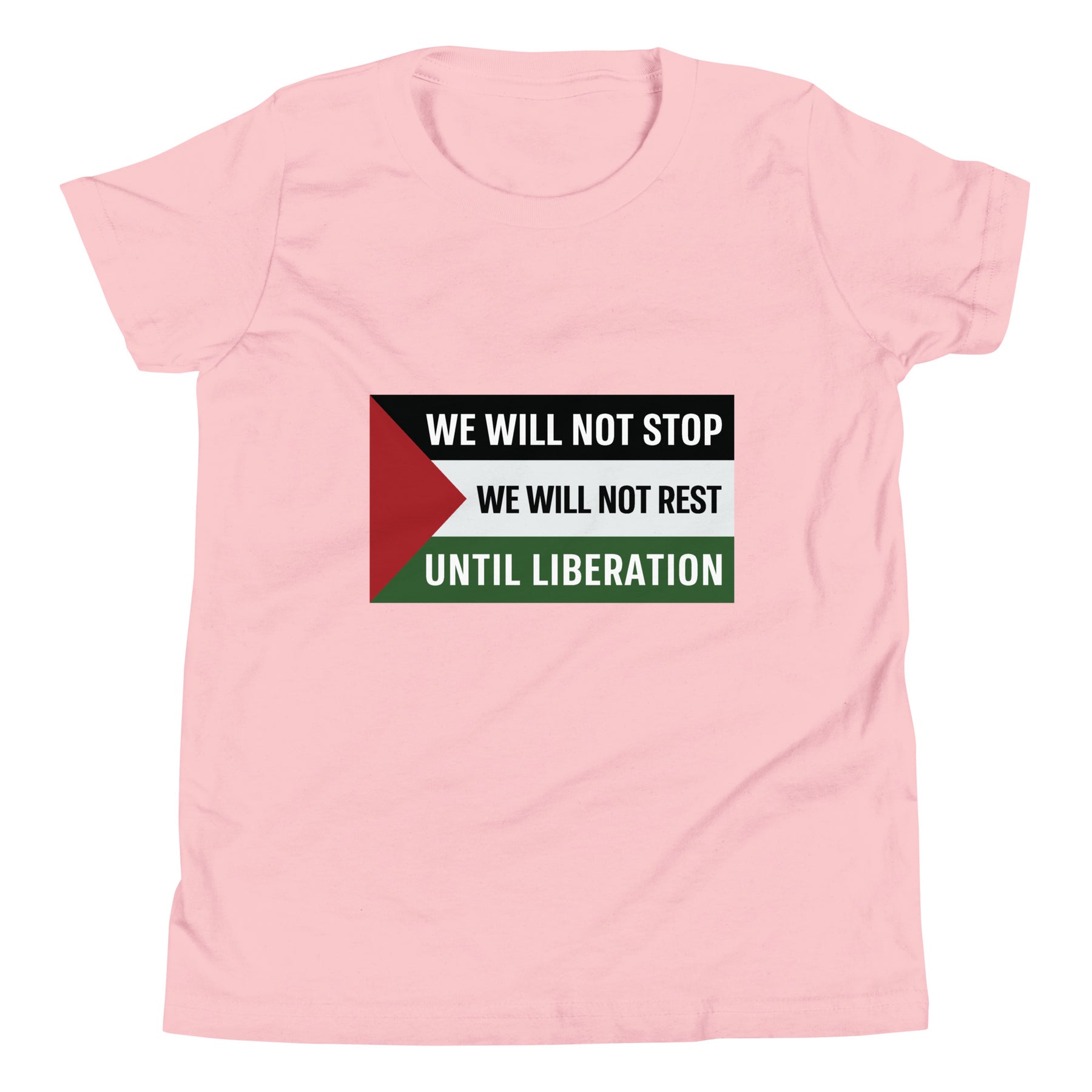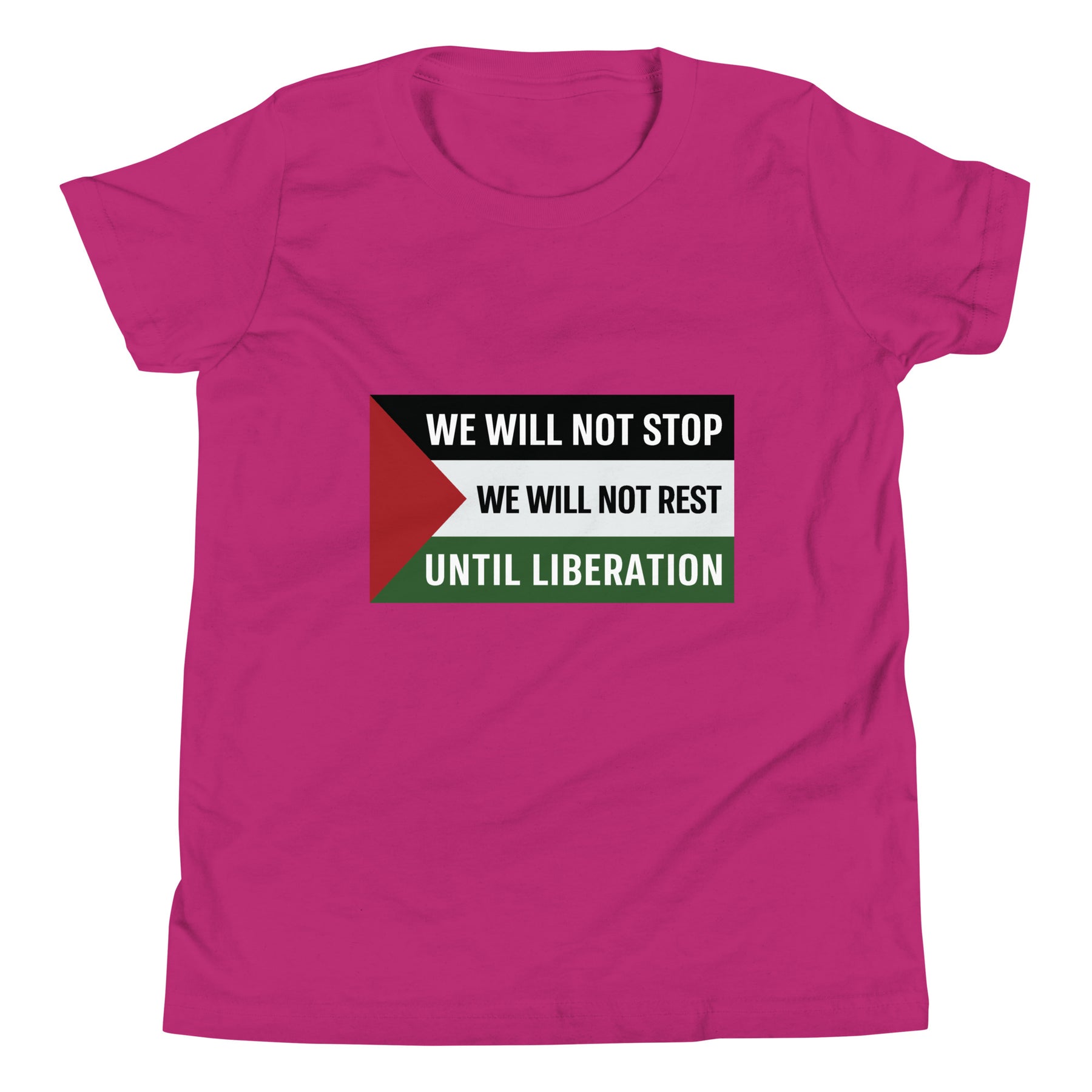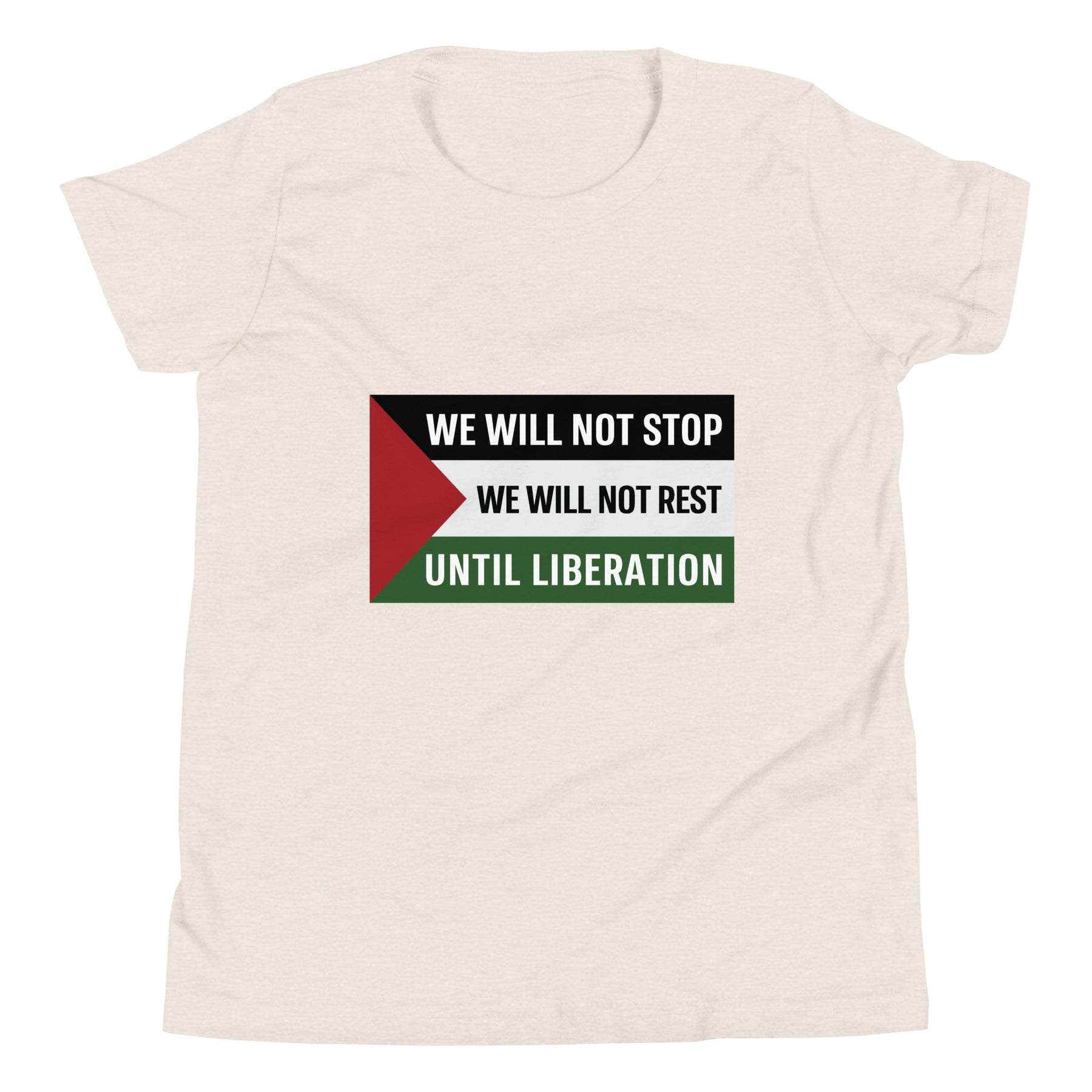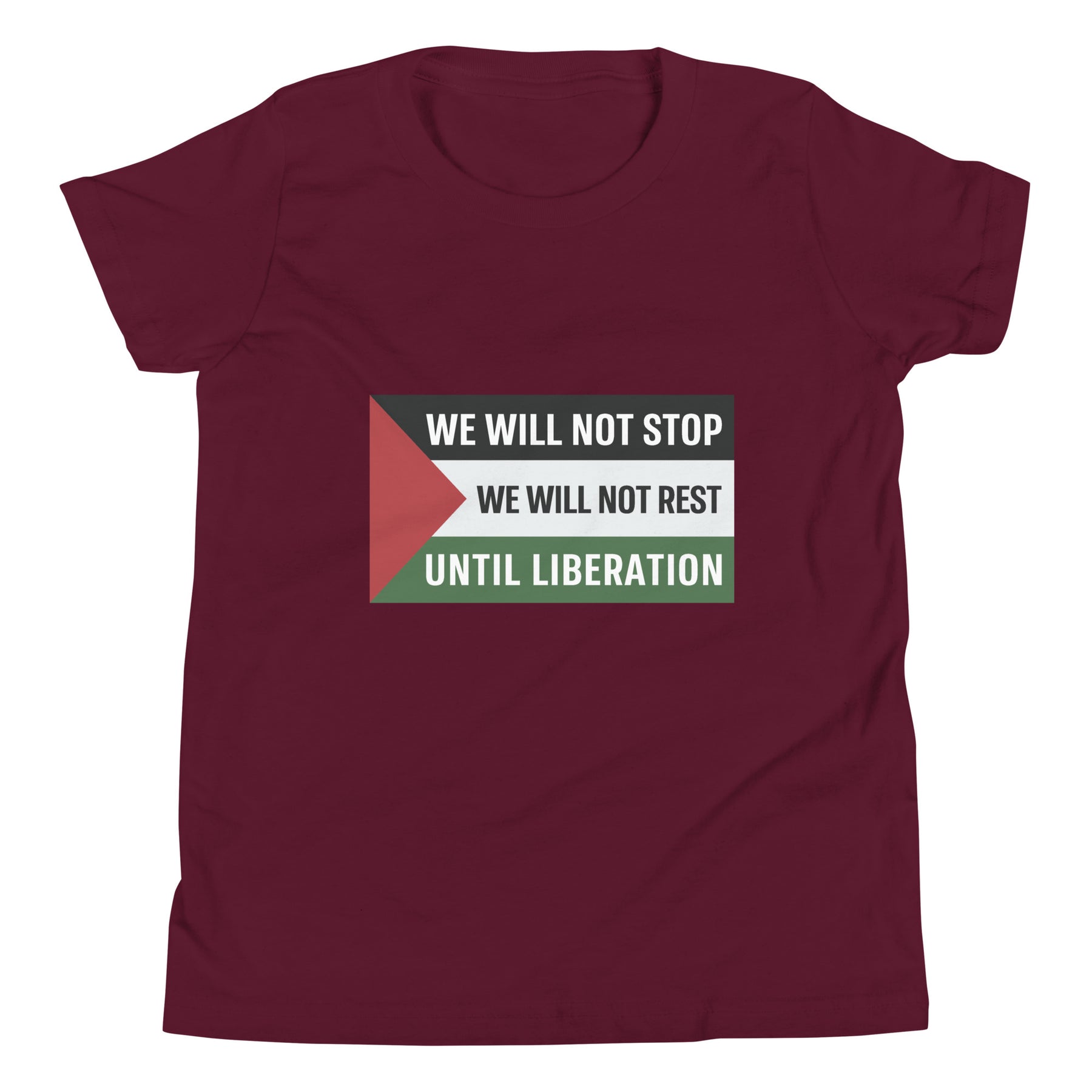 Let the next generation wear their voice. This soft, durable Free Palestine youth t-shirt features the bold declaration: “We will not stop. We will not rest. Until liberation.” — a message of hope, resistance, and unity with the people of Palestine and Gaza.