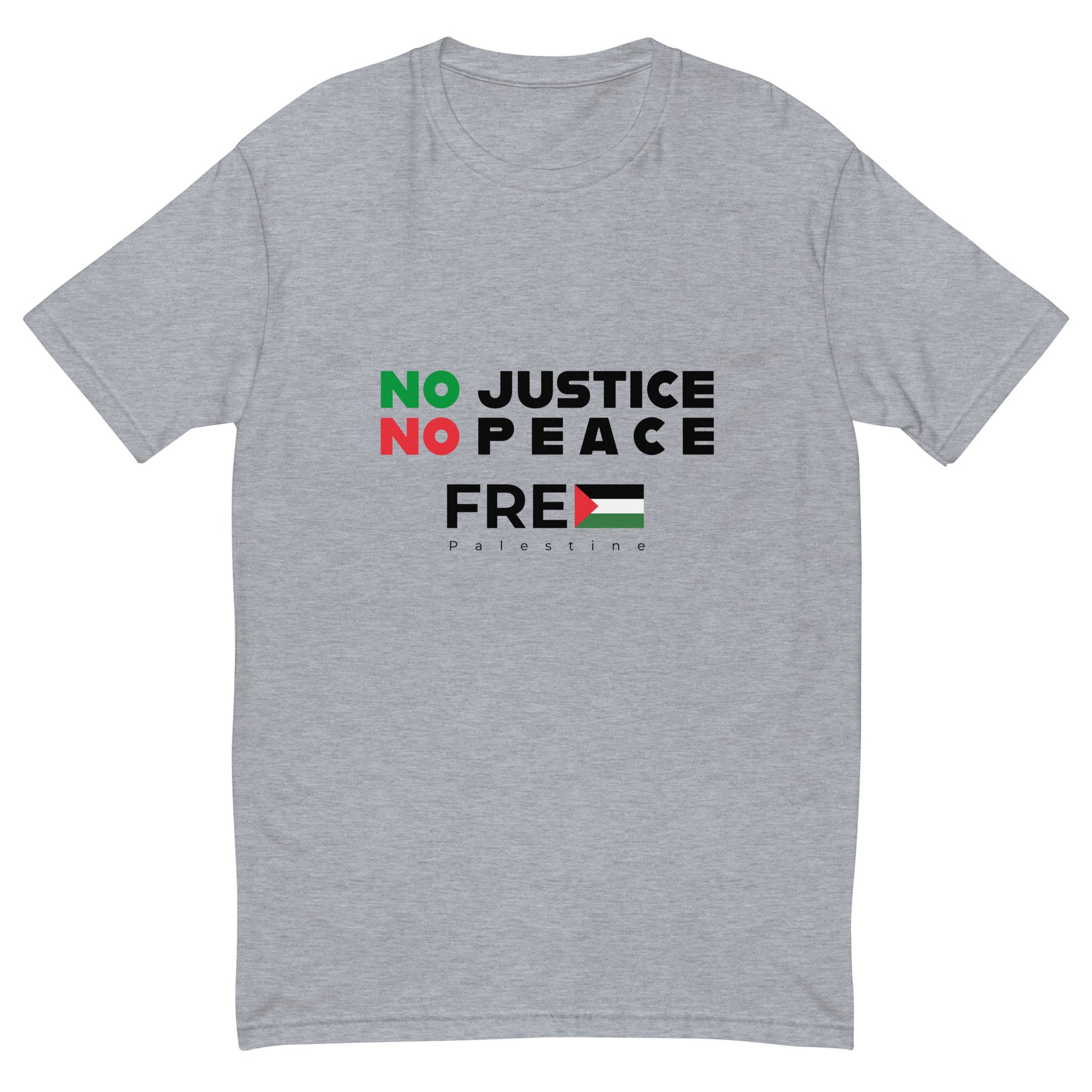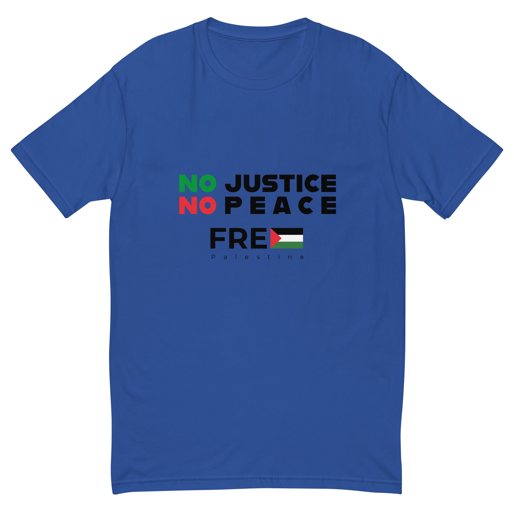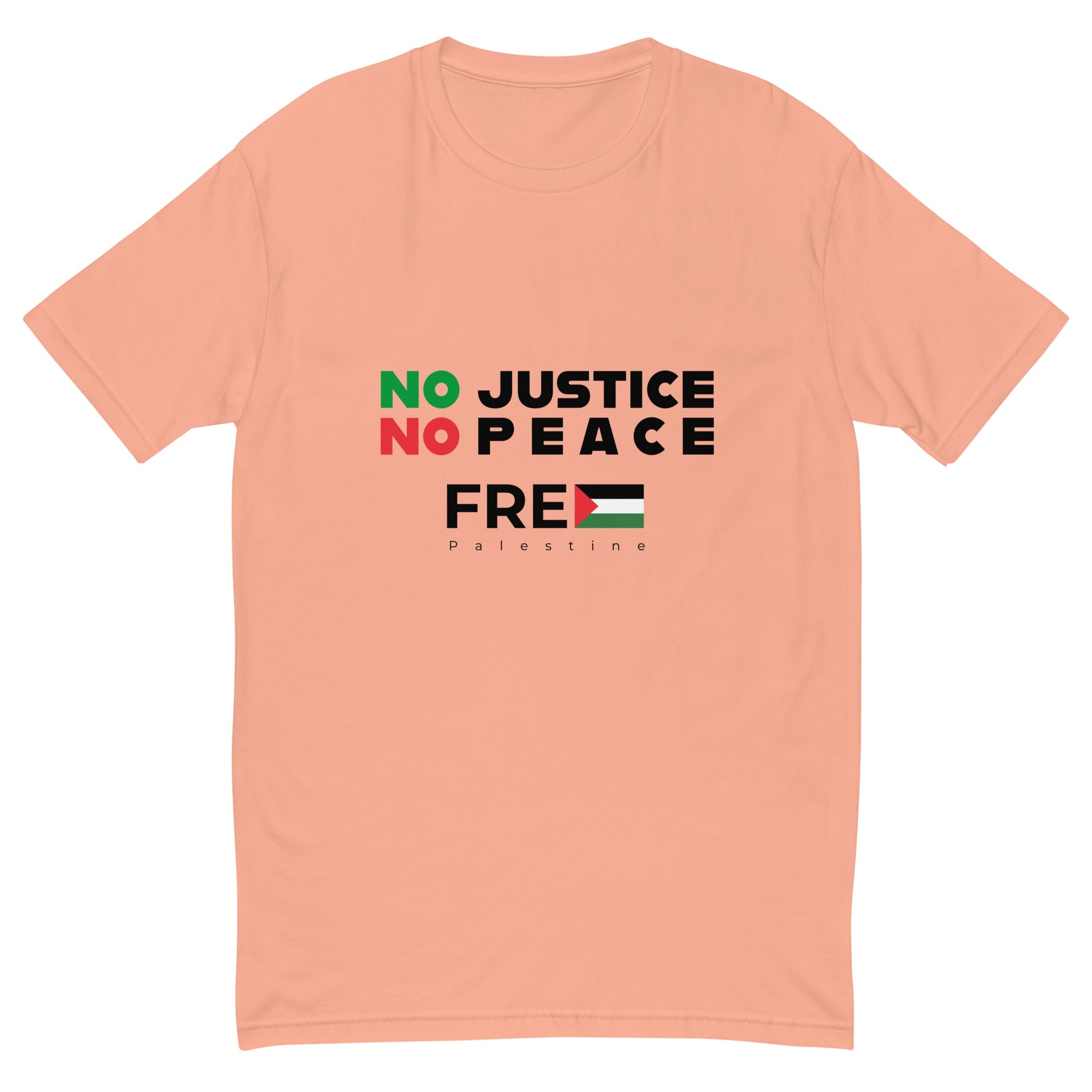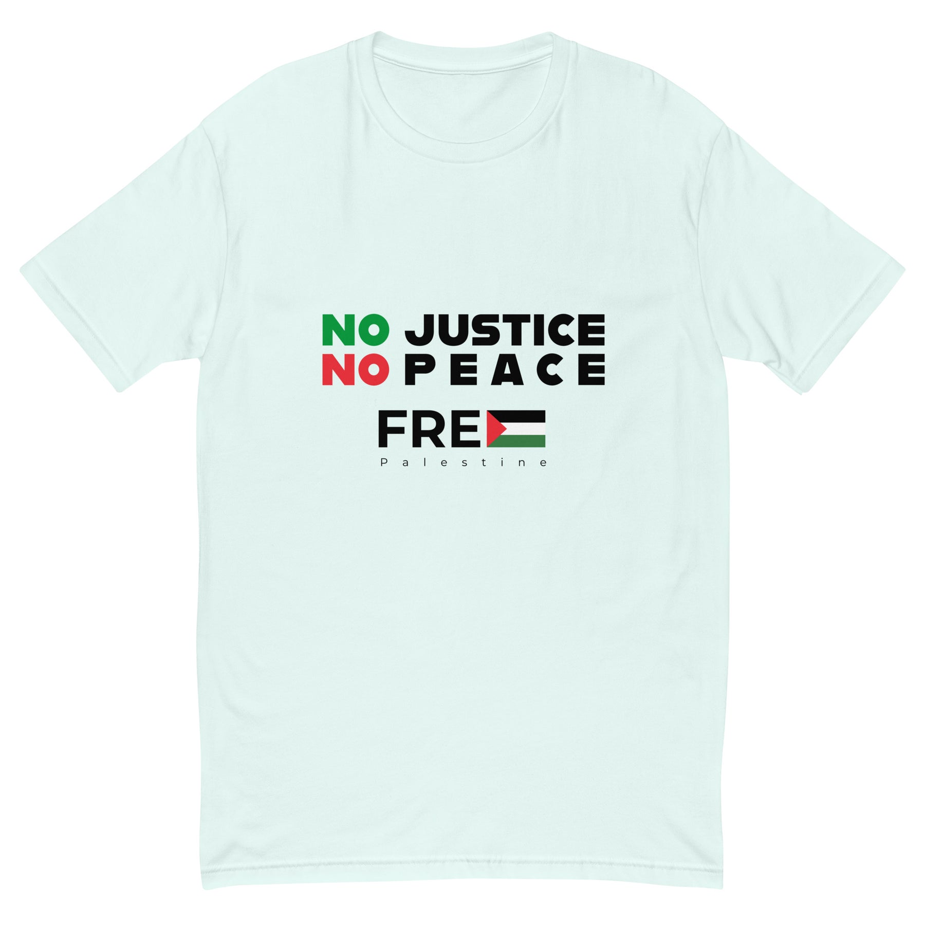 This Free Palestine short sleeve t-shirt is a daily reminder that peace cannot exist without justice. Featuring the bold and unflinching slogan “No Justice No Peace,” it stands with Palestine, the people of Gaza, and all who fight against oppression and apartheid.