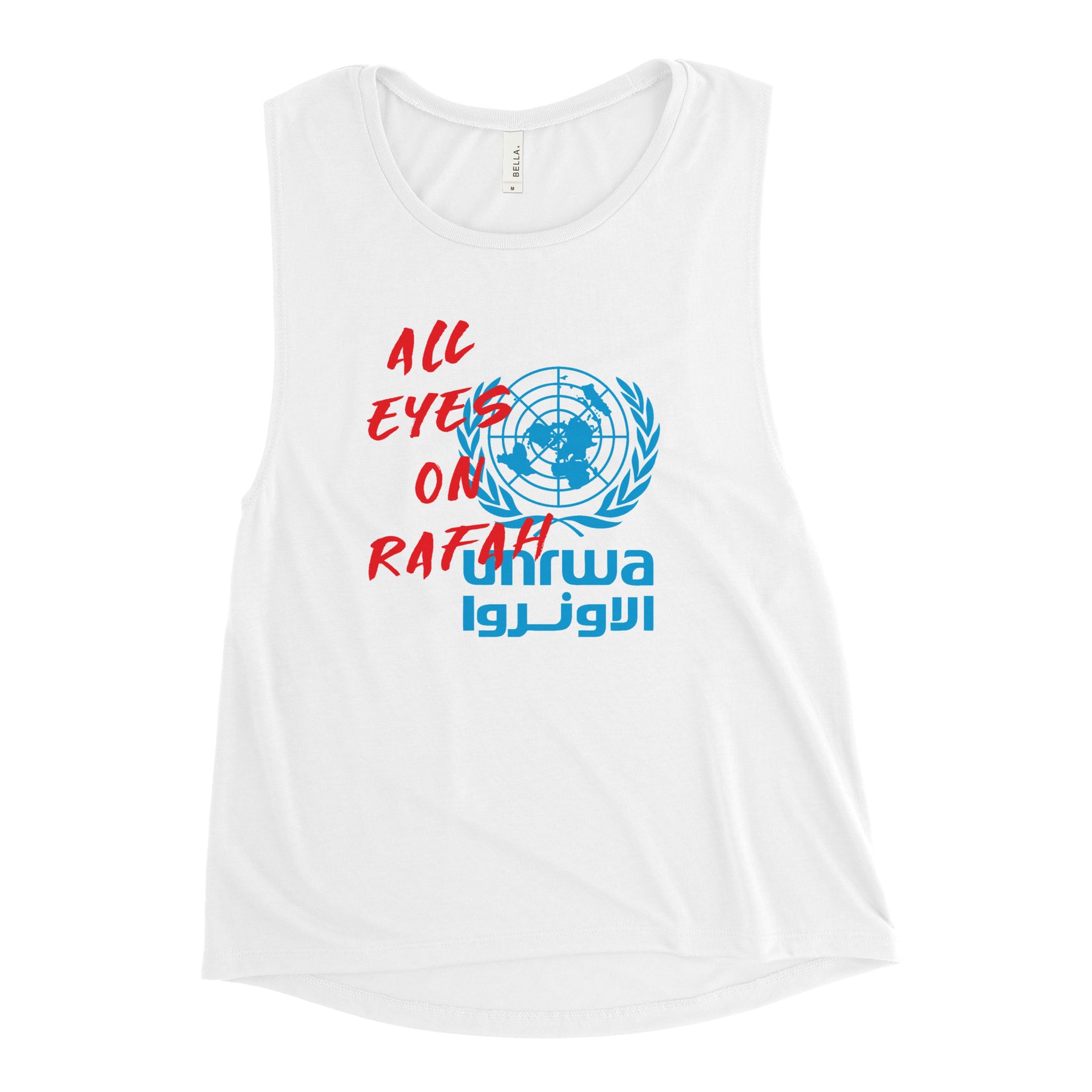 Show off your strength and style with our "All Eyes on Rafah" Ladies’ Muscle Tank. Made from ultra-soft, breathable fabric, this tank ensures comfort and freedom of movement, perfect for workouts or casual wear. The sleeveless design and relaxed fit provide a flattering silhouette, while the striking graphic, inspired by the vibrant spirit of Rafah, adds an artistic flair. Ideal for pairing with leggings, shorts, or jeans, this muscle tank combines functionality and fashion, making it a standout addition to your active wardrobe.
